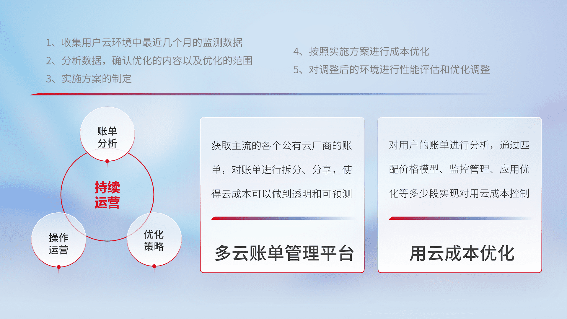 通过多云纳管,,以统一的资源数据模型把客户的云资源进行抽象和封装,,进而实现对多云资源的统一操作,,保障云资源管理的可靠性、、、稳定性与可用性。。。量身定制化运维内容,,配置、、、开发运维、、、补丁管理、、、、备份、、、监控、、、认证和访问管理、、、审计和日常巡检等,,,保障在用云过程中的可靠度,,稳定度以及高可用率。。。
